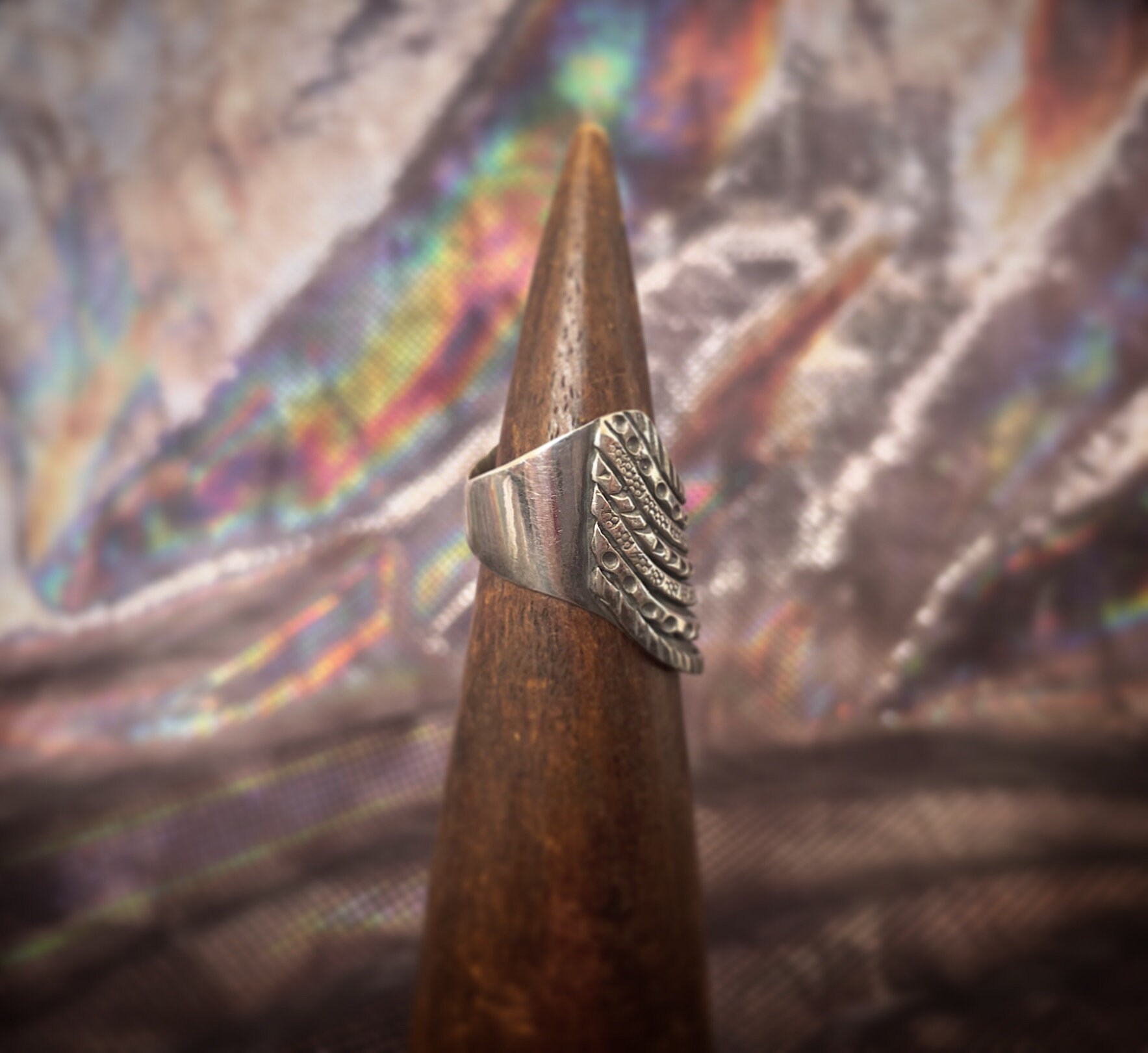 Very unique and unusual tribal sterling ring with a lying shape which goes down on your finger and makes it look longer.