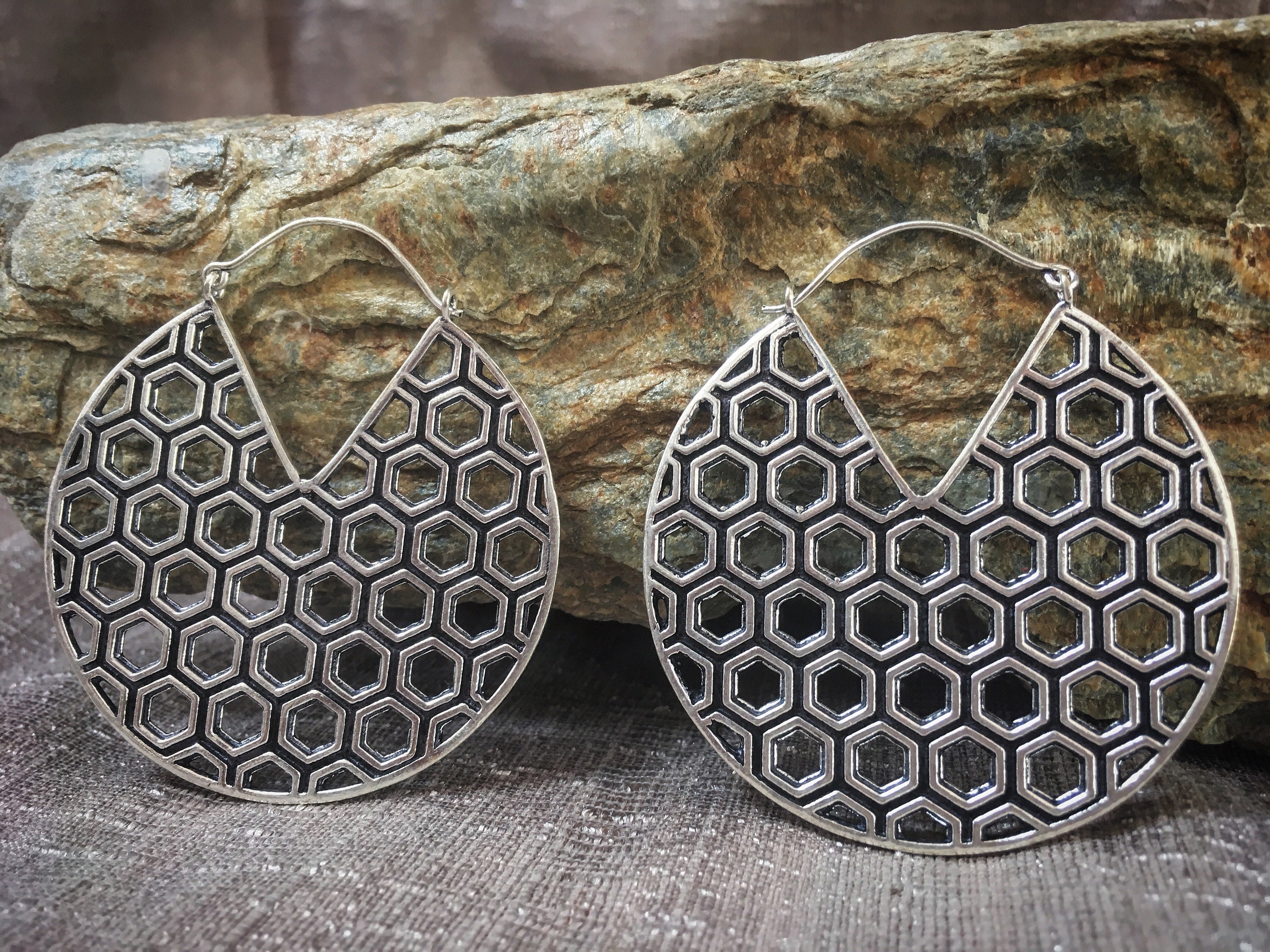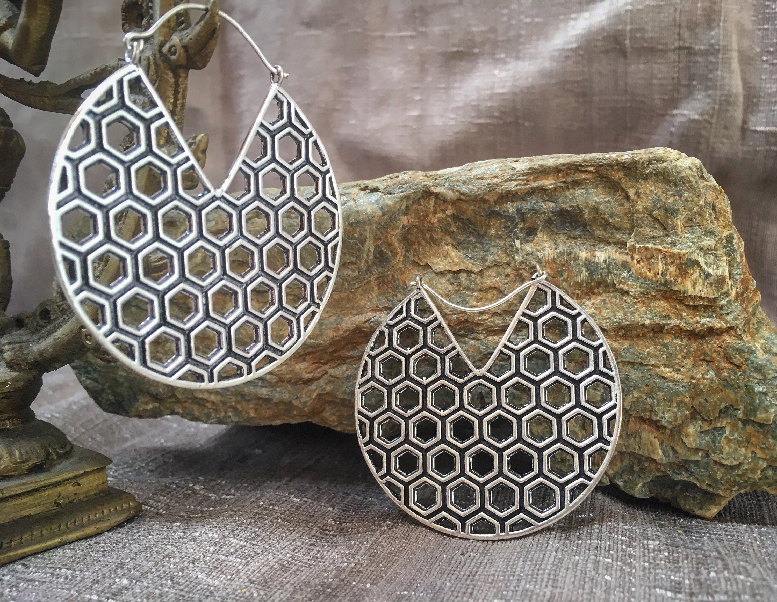 Original and unusual hexagon, hive shape, big hoops.